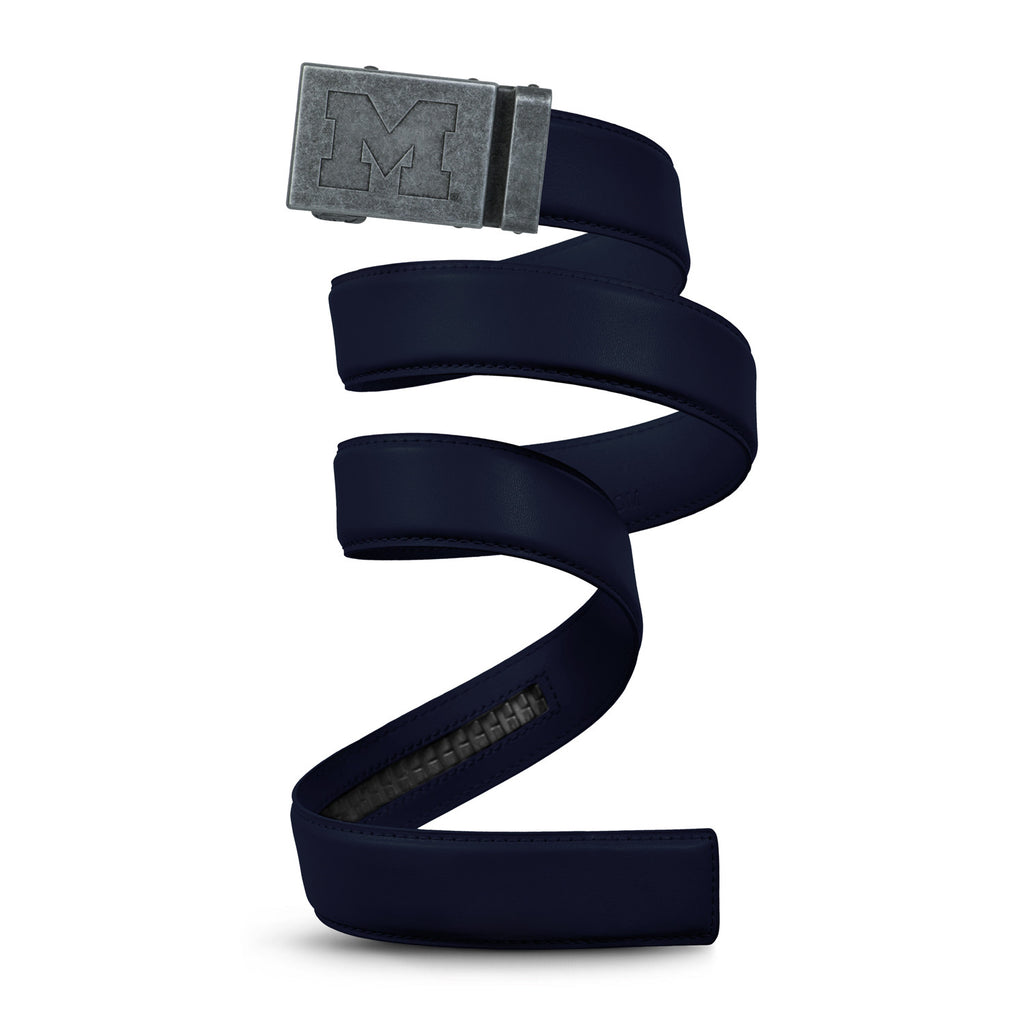The officially licensed Michigan Wolverines Belt features an imprinted team logo and team name on the buckle under a clear acrylic finish. Genuine leather strap with protective coating and the interior houses a special track which is part of the unique no-holes perfect fit system. The buckle can be detached from the leather strap so you can always trim it down to size.
