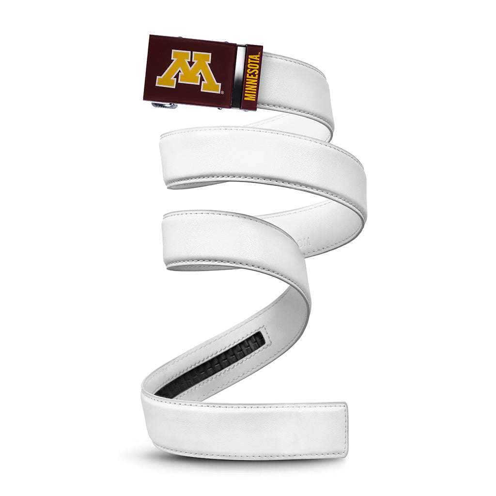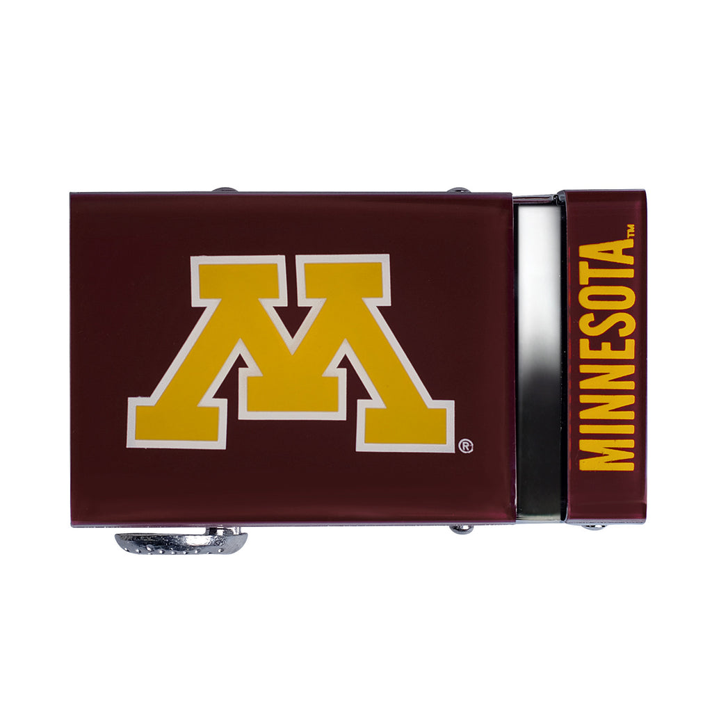 The officially licensed Minnesota Golden Gophers Belt features an imprinted team logo and team name on the buckle under a clear acrylic finish. Genuine leather strap with protective coating and the interior houses a special track which is part of the unique no-holes perfect fit system. The buckle can be detached from the leather strap so you can always trim it down to size.