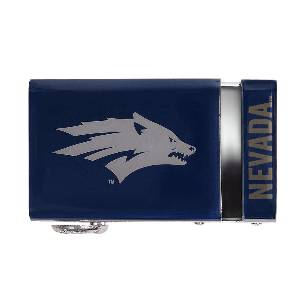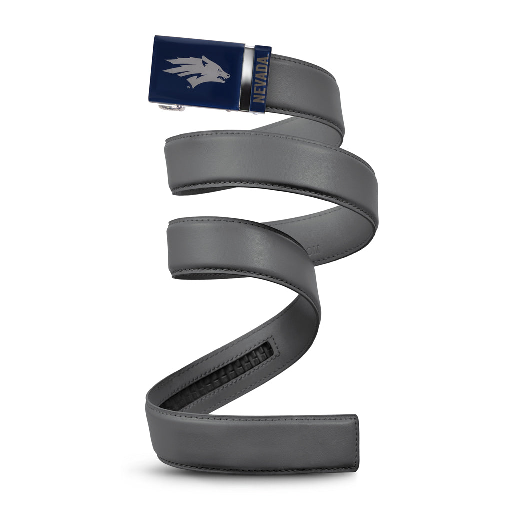 The officially licensed Nevada Wolf Pack Belt features an imprinted team logo and team name on the buckle under a clear acrylic finish. Genuine leather strap with protective coating and the interior houses a special track which is part of the unique no-holes perfect fit system. The buckle can be detached from the leather strap so you can always trim it down to size.