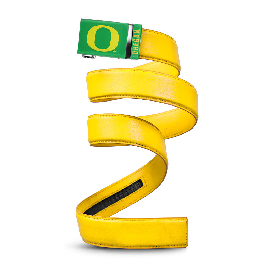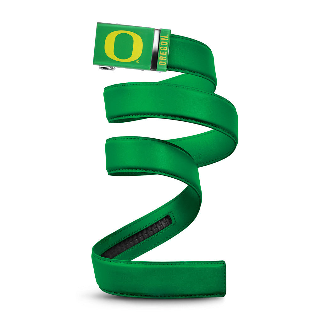The officially licensed Oregon Ducks (Green) Belt features an imprinted team logo and team name on the buckle under a clear acrylic finish. Genuine leather strap with protective coating and the interior houses a special track which is part of the unique no-holes perfect fit system. The buckle can be detached from the leather strap so you can always trim it down to size.