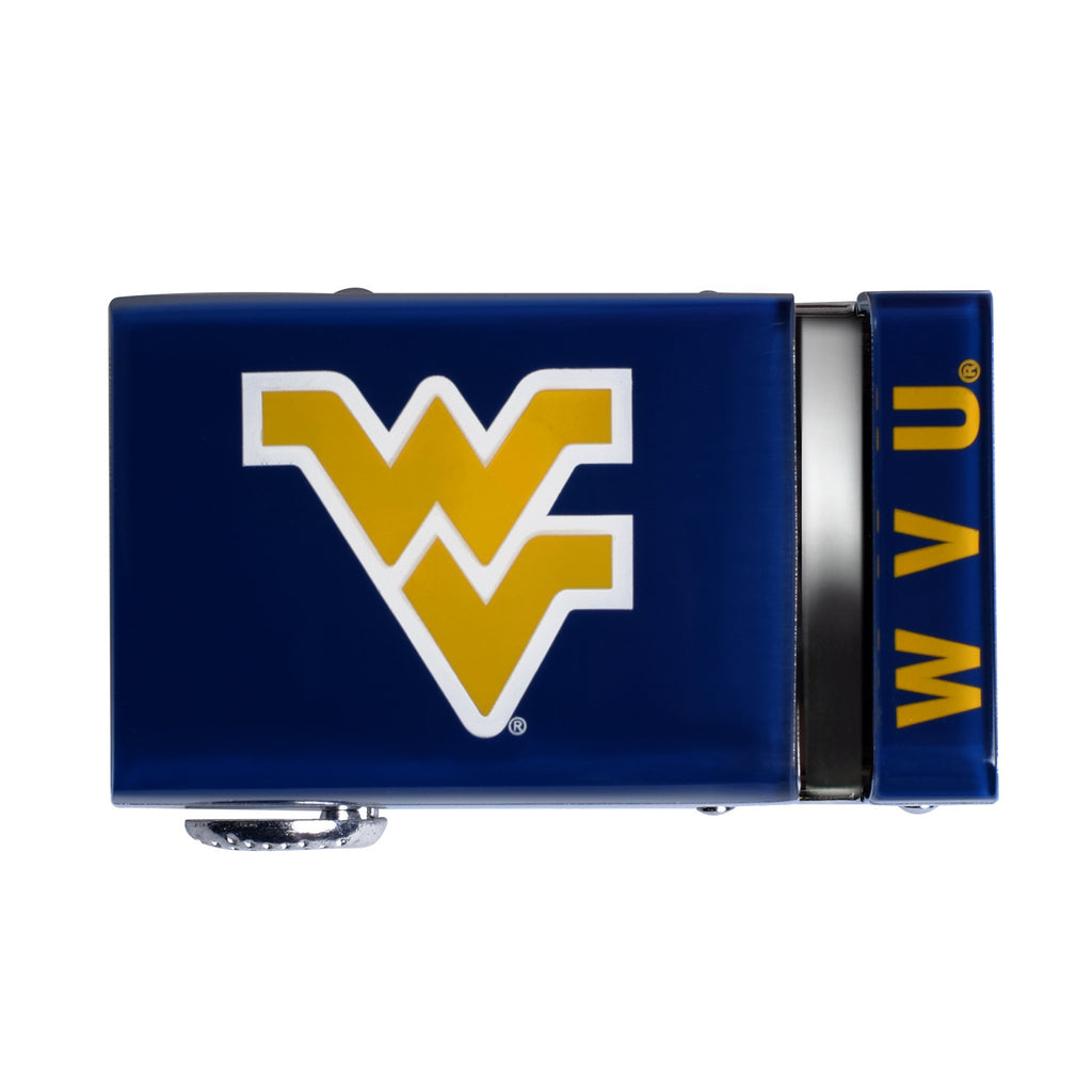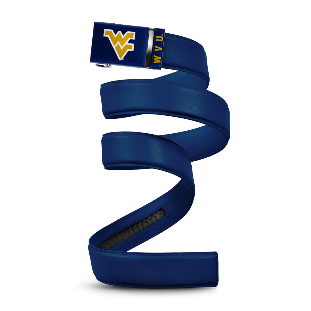 The officially licensed West Virginia Mountaineers Belt features an imprinted team logo and team name on the buckle under a clear acrylic finish. Genuine leather strap with protective coating and the interior houses a special track which is part of the unique no-holes perfect fit system. The buckle can be detached from the leather strap so you can always trim it down to size.