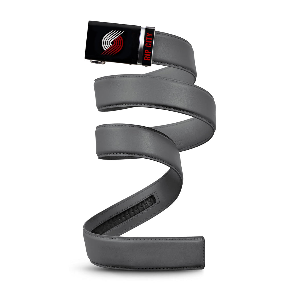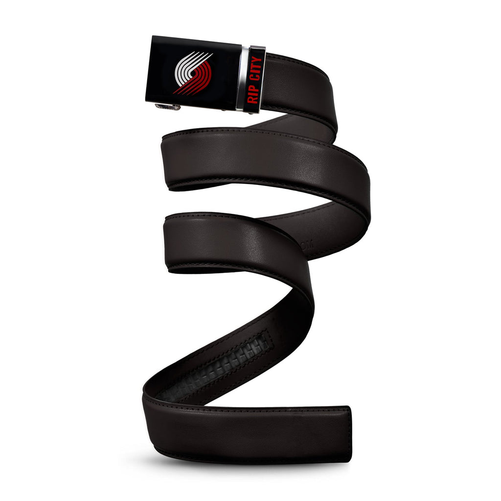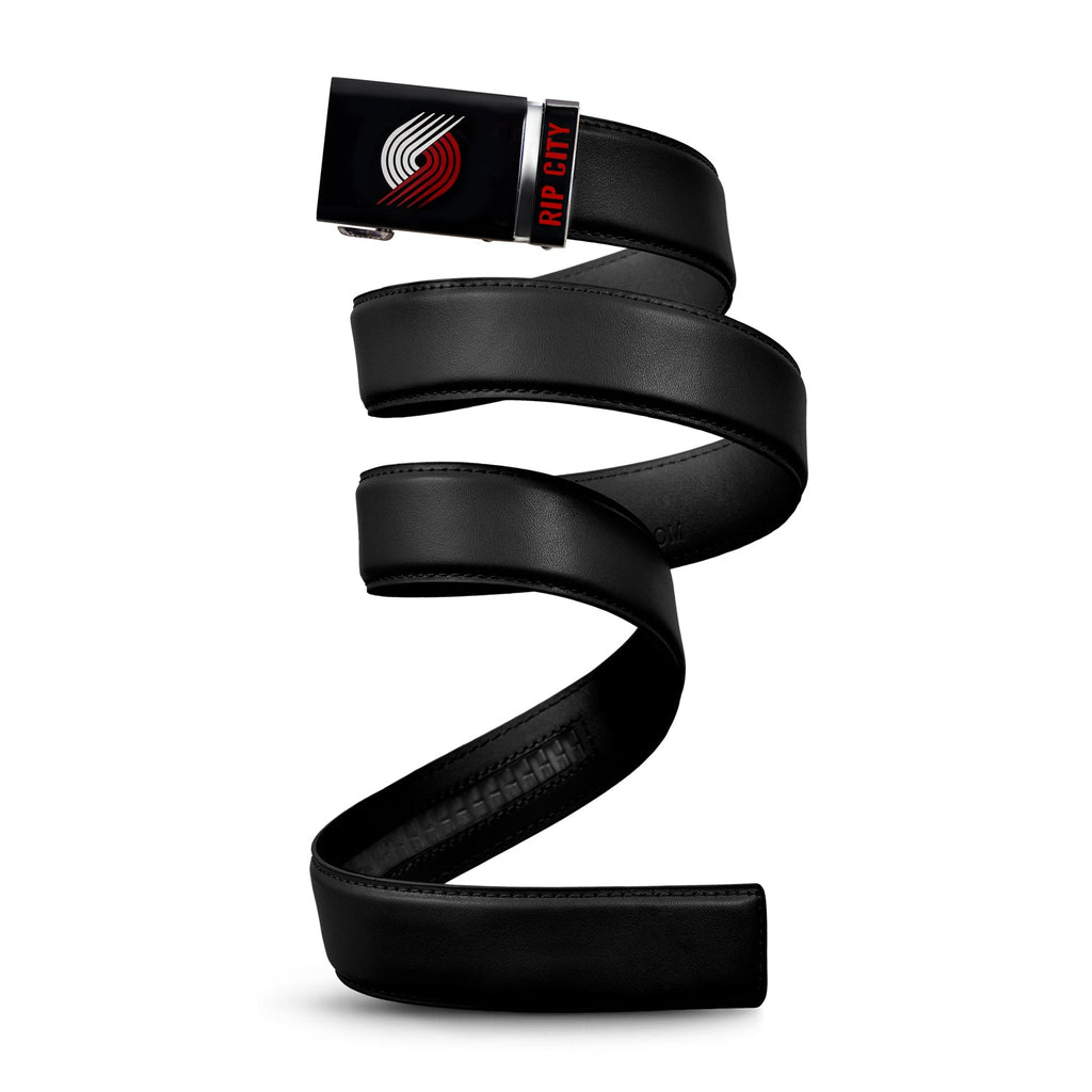 The officially licensed Portland Trailblazers Belt from Mission Belt Co. features an imprinted team logo and team name on the buckle under a clear acrylic finish. Genuine leather strap with protective coating and the interior houses a special track which is part of the unique no-holes perfect fit system. The buckle can be detached from the leather strap so you can always trim it down to size.