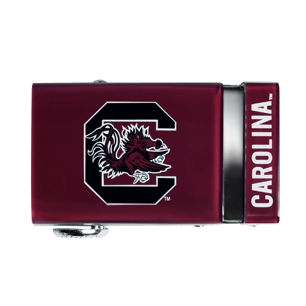 The officially licensed South Carolina Gamecocks Belt features an imprinted team logo and team name on the buckle under a clear acrylic finish. Genuine leather strap with protective coating and the interior houses a special track which is part of the unique no-holes perfect fit system. The buckle can be detached from the leather strap so you can always trim it down to size.