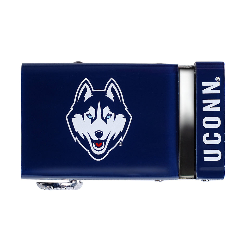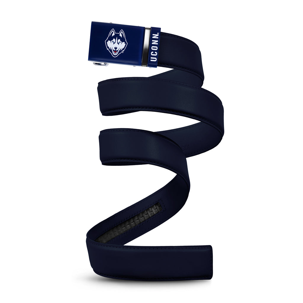 The officially licensed UConn Huskies Belt features an imprinted team logo and team name on the buckle under a clear acrylic finish. Genuine leather strap with protective coating and the interior houses a special track which is part of the unique no-holes perfect fit system. The buckle can be detached from the leather strap so you can always trim it down to size.